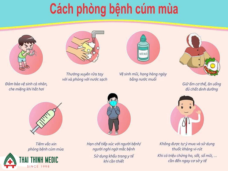 - Tiêm vắc xin cúm hằng năm là phương pháp hiệu quả nhất để phòng cúm và các biến chứng. Vắc xin phòng cúm có thể tiêm cho trẻ từ 6 tháng tuổi trở lên, hiệu quả đạt khoảng 40- 70% tùy mùa cúm. Cha mẹ nên tiêm trước mùa dịch 1- 2 tháng để cơ thể có thời gian tạo kháng thể kịp thời.