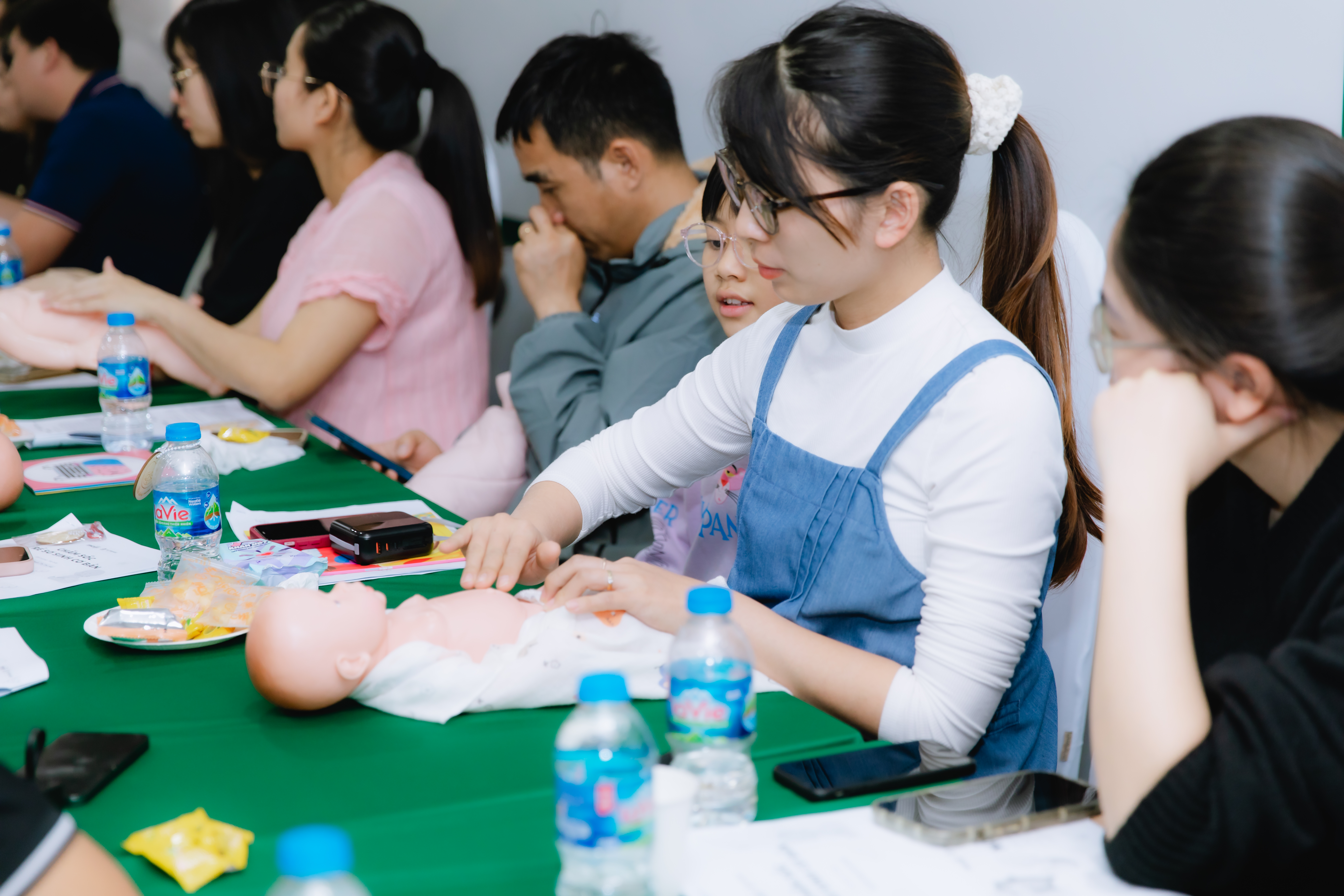 Điểm nổi bật của buổi học chính là trải nghiệm thực hành trực tiếp trên búp bê mô phỏng. Tất cả bố mẹ tham gia đều có cơ hội tự tay thực hành dưới sự hỗ trợ và chỉnh sửa kịp thời từ chuyên gia. Không khí lớp học trở nên sôi nổi hơn khi những bỡ ngỡ ban đầu dần được thay thế bằng sự tự tin và những nụ cười thoải mái. Nhiều bố mẹ chia sẻ rằng, nhờ phần thực hành này, họ đã cảm thấy yên tâm hơn rất nhiều, không còn quá lo lắng khi nghĩ đến việc tự tắm bé hay chăm sóc con trong những ngày đầu sau sinh.