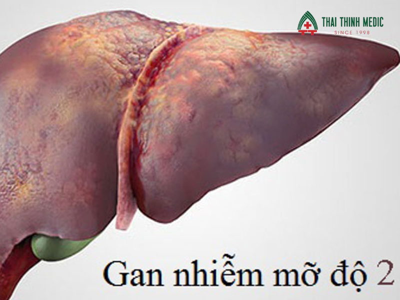 Gan nhiễm mỡ độ 2 là giai đoạn trung bình, trong đó lượng mỡ tích tụ trong gan nhiều hơn và đã ảnh hưởng rõ đến cấu trúc nhu mô gan. Trên siêu âm, gan tăng hồi âm rõ rệt, sáng hơn đáng kể so với thận hoặc lách. Khả năng xuyên âm của sóng siêu âm bắt đầu giảm, khiến hình ảnh các cấu trúc sâu trong gan và các mạch máu gan trở nên mờ hơn.