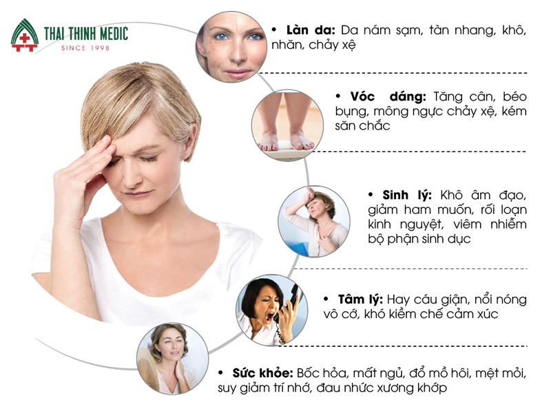 Người bệnh có thể gặp bốc hỏa, nóng bừng mặt, đổ mồ hôi ban đêm, đặc biệt rõ rệt khi thời tiết nóng hoặc căng thẳng. Bên cạnh đó là cảm giác mệt mỏi kéo dài, khó ngủ, giảm khả năng tập trung, dễ cáu gắt hoặc thay đổi tâm trạng thất thường. Nhiều phụ nữ còn gặp tình trạng khô âm đạo, giảm tiết dịch, gây đau rát khi quan hệ tình dục và ảnh hưởng đến đời sống vợ chồng.Do các triệu chứng này không đặc hiệu, người bệnh thường nhầm lẫn với stress, trầm cảm nhẹ hoặc rối loạn nội tiết thông thường.