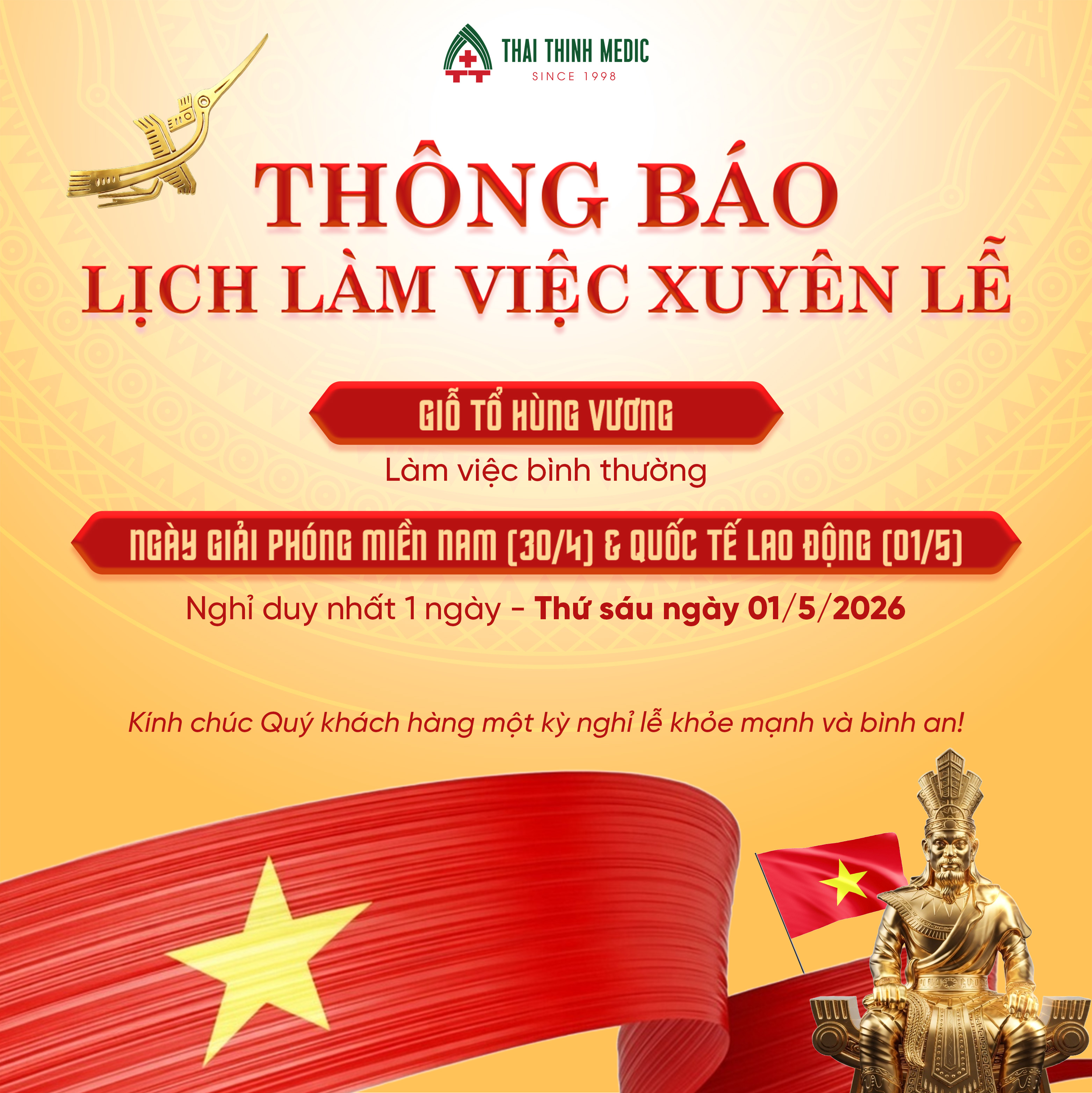Nhằm giúp Quý Khách hàng chủ động sắp xếp thời gian thăm khám và sử dụng dịch vụ, Phòng khám 125 Thái Thịnh - Thai Thinh Medic xin trân trọng thông báo lịch làm việc trong dịp lễ Giỗ Tổ Hùng Vương và kỳ nghỉ 30/4 – 01/5. Trong suốt thời gian này, chúng tôi vẫn duy trì hoạt động ổn định nhằm đảm bảo chất lượng dịch vụ và hỗ trợ khách hàng tốt nhất. Kính mong Quý Khách hàng theo dõi lịch làm việc chi tiết dưới đây để thuận tiện trong việc đặt lịch và đến khám.