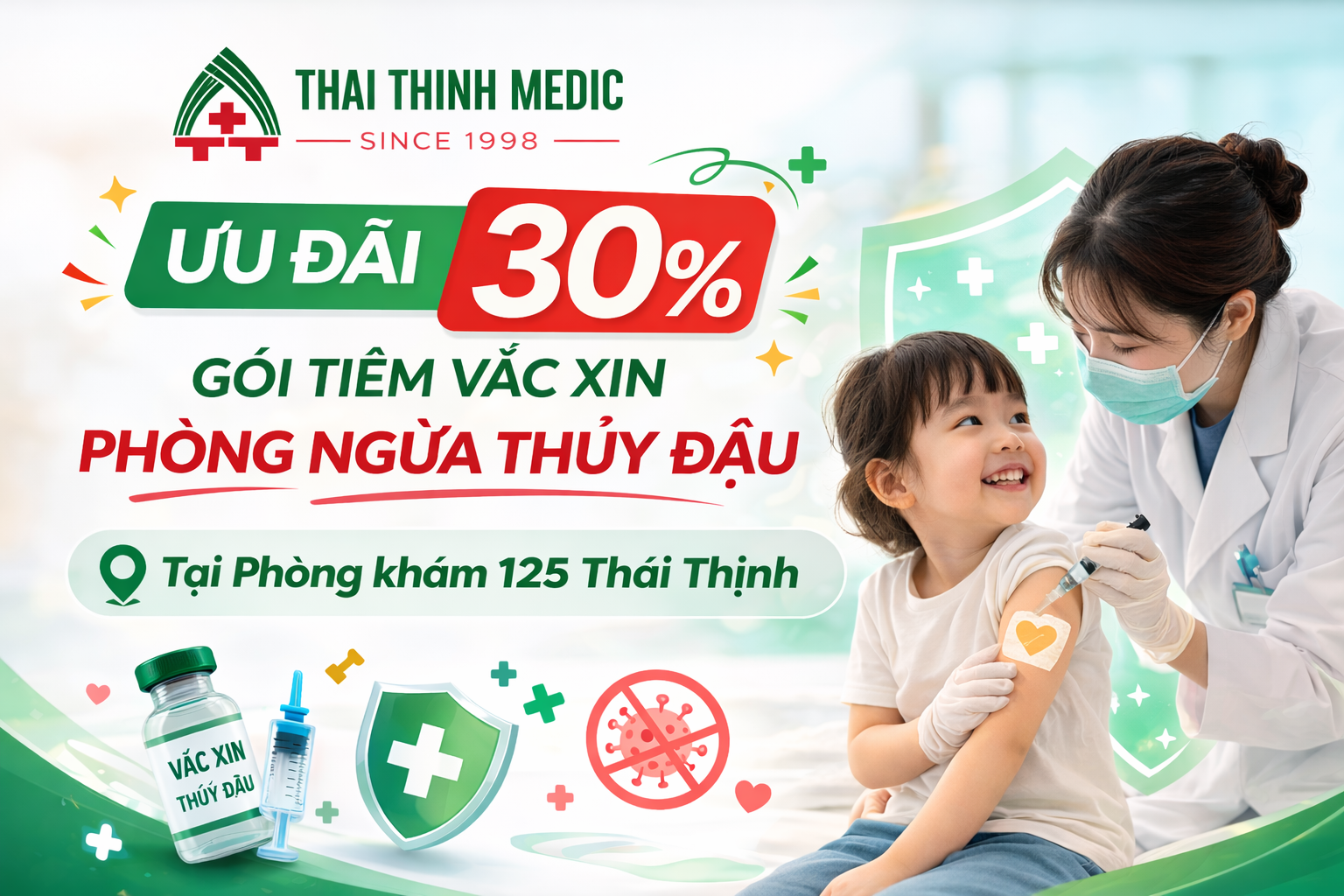 Tiêm vắc xin phòng thủy đậu là cách hiệu quả giúp chủ động bảo vệ sức khỏe cho cả trẻ nhỏ và người lớn trước nguy cơ mắc bệnh và các biến chứng có thể xảy ra. Với chương trình giảm 30% gói tiêm vắc xin phòng thủy đậu, Phòng khám 125 Thái Thịnh – Thai Thinh Medic mang đến cơ hội tiêm chủng an toàn với chi phí tiết kiệm hơn. Nếu bạn đang có nhu cầu tiêm phòng cho bản thân hoặc người thân, hãy liên hệ Phòng khám 125 Thái Thịnh để được tư vấn và đặt lịch sớm, tận dụng ưu đãi hấp dẫn và chủ động bảo vệ sức khỏe cho gia đình.